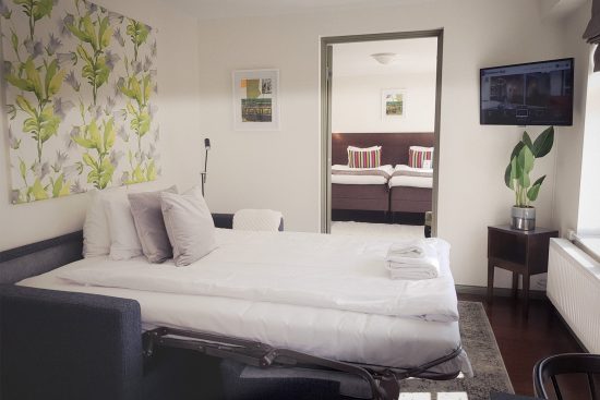 One of our most luxurious rooms – perfect for the wedding night, a romantic weekend, or when you desire an extra indulgent hotel stay. Here, you’ll find adjustable beds, balconys, an extra large kitchenette with refrigerator, stove, microwave oven, kettle, dishwasher, kitchen utensils and an espresso coffee machine.